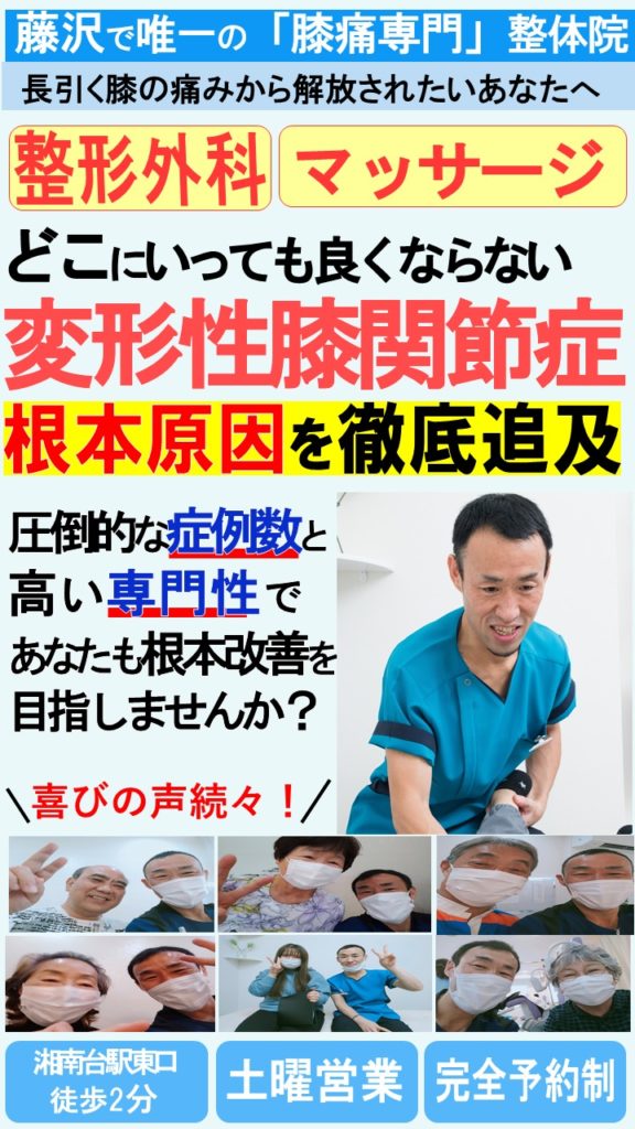私はあなたのツラい膝痛を本気で改善したいと思っている、藤沢・湘南台で「唯一」の膝痛専門の治療家です。